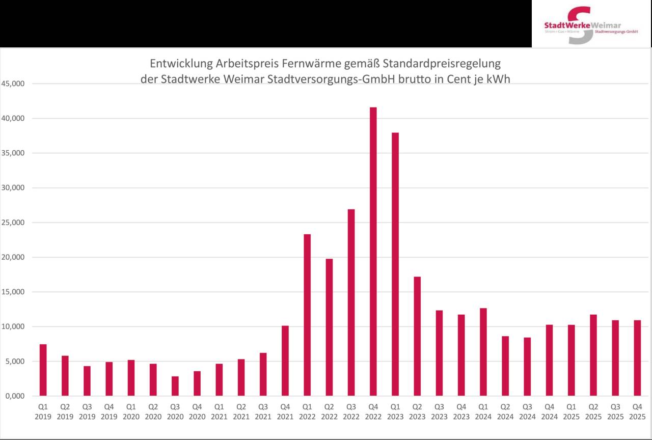 Die Fernwärmepreise in Weimar sind sowohl stabil als auch attraktiv. Aktuell liegt der Arbeitspreis für Privatkunden bei 10,94 Cent pro Kilowattstunde und der Grundpreis bei 68,58 pro Kilowatt Anschlussleistung jährlich (brutto; Stand: Juli 2025). Aktuell liegen die Wärmepreise der Stadtwerke Weimar laut Transparenzplattform unter dem Bundesdurchschnitt. Während der Energiekrise waren die Preise im Jahr 2022 vorübergehend gestiegen. Seitdem haben sich die Energiemärkte wieder entspannt. Wir haben die Preisvorteile zeitnah an die Kundinnen und Kunden weitergegeben. Das ermöglicht die kurzfristige Einkaufsstrategie, durch die wir immer nah am Markt agieren, und unsere Berechnungsgrundlage. Ein Vergleich unserer Preise mit denen anderer Anbieter finden Sie unter www.waermepreise.info.